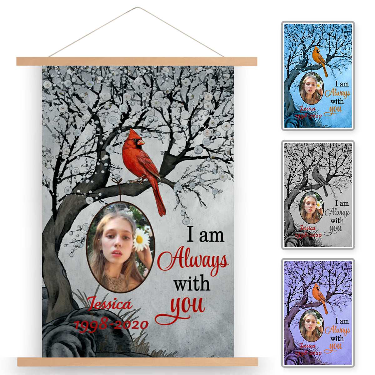 Always With You Blossom Tree Personalized Memorial Cardinal Scroll Painting With Wooden Poster Hanger