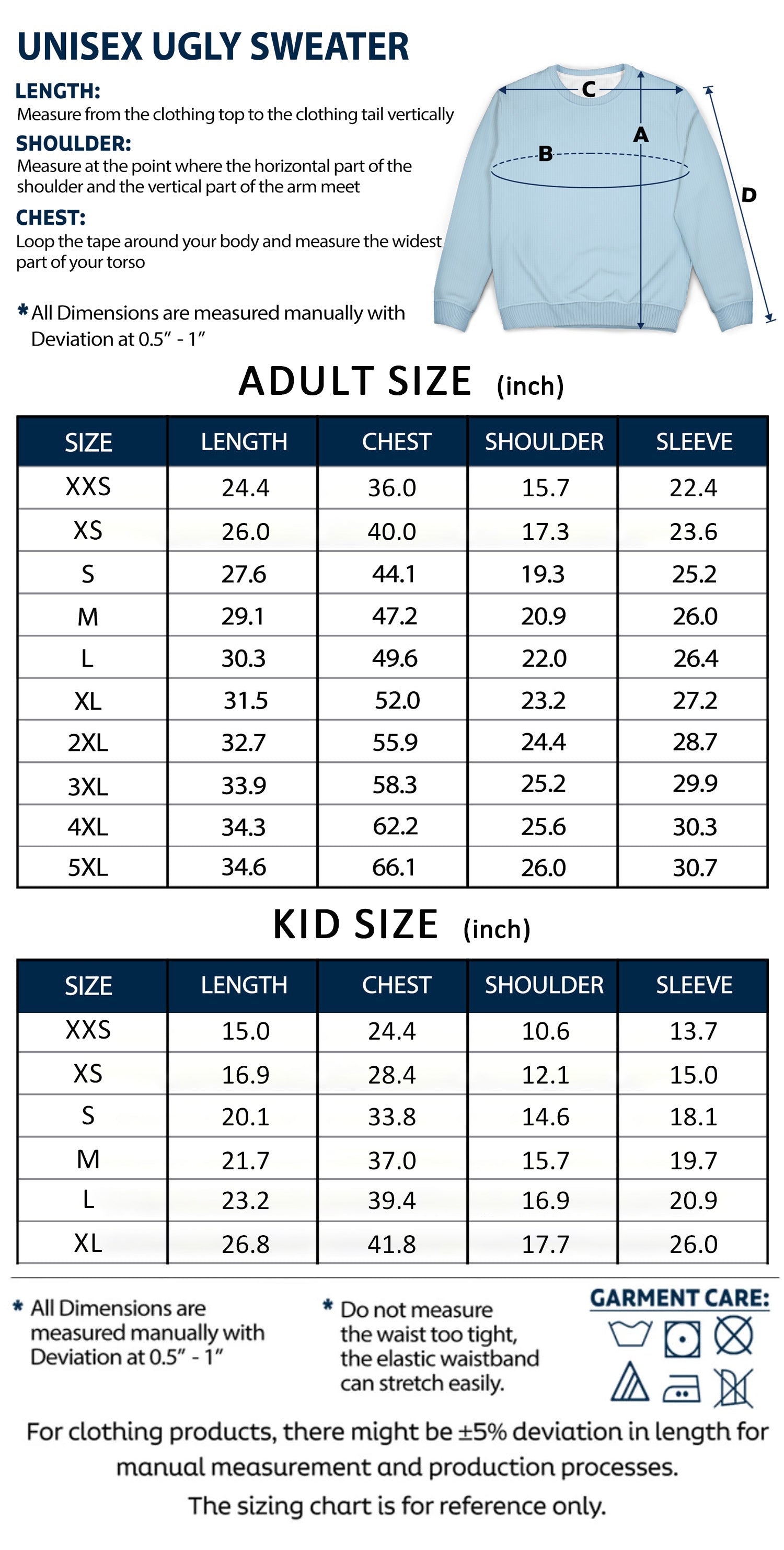Please check the size chart and measurement information to help you find your perfect fit in our Ugly Sweater. Different measurement of 1-2 cm due to manual is allowed.