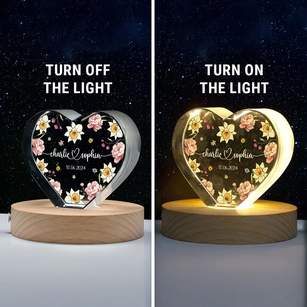 Couple Name Birth Month Flower Premium Crystal Heart LED, Unique Personalized Gift For Couple, For Him, For Her, Perfect Last-minute Valentine's Gift