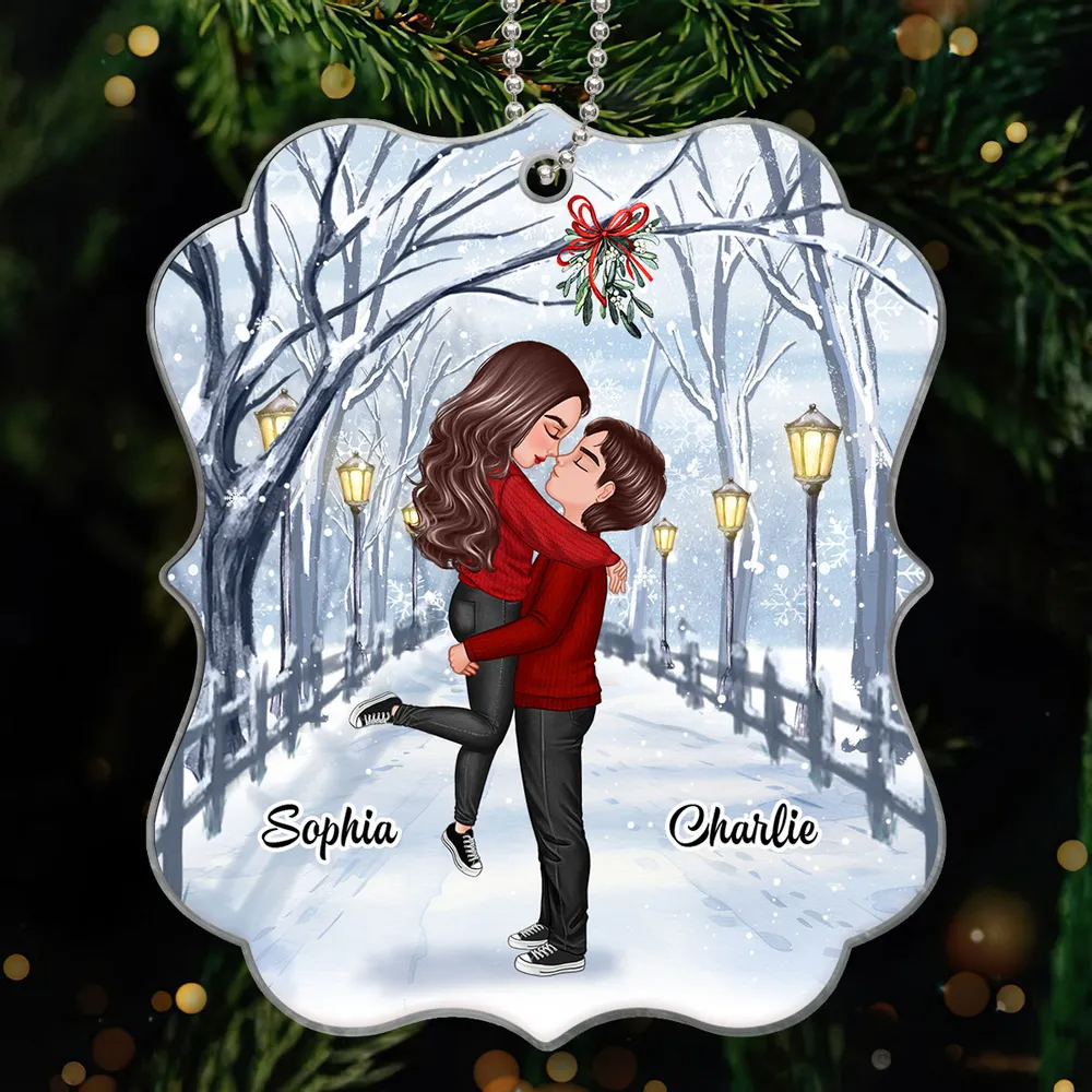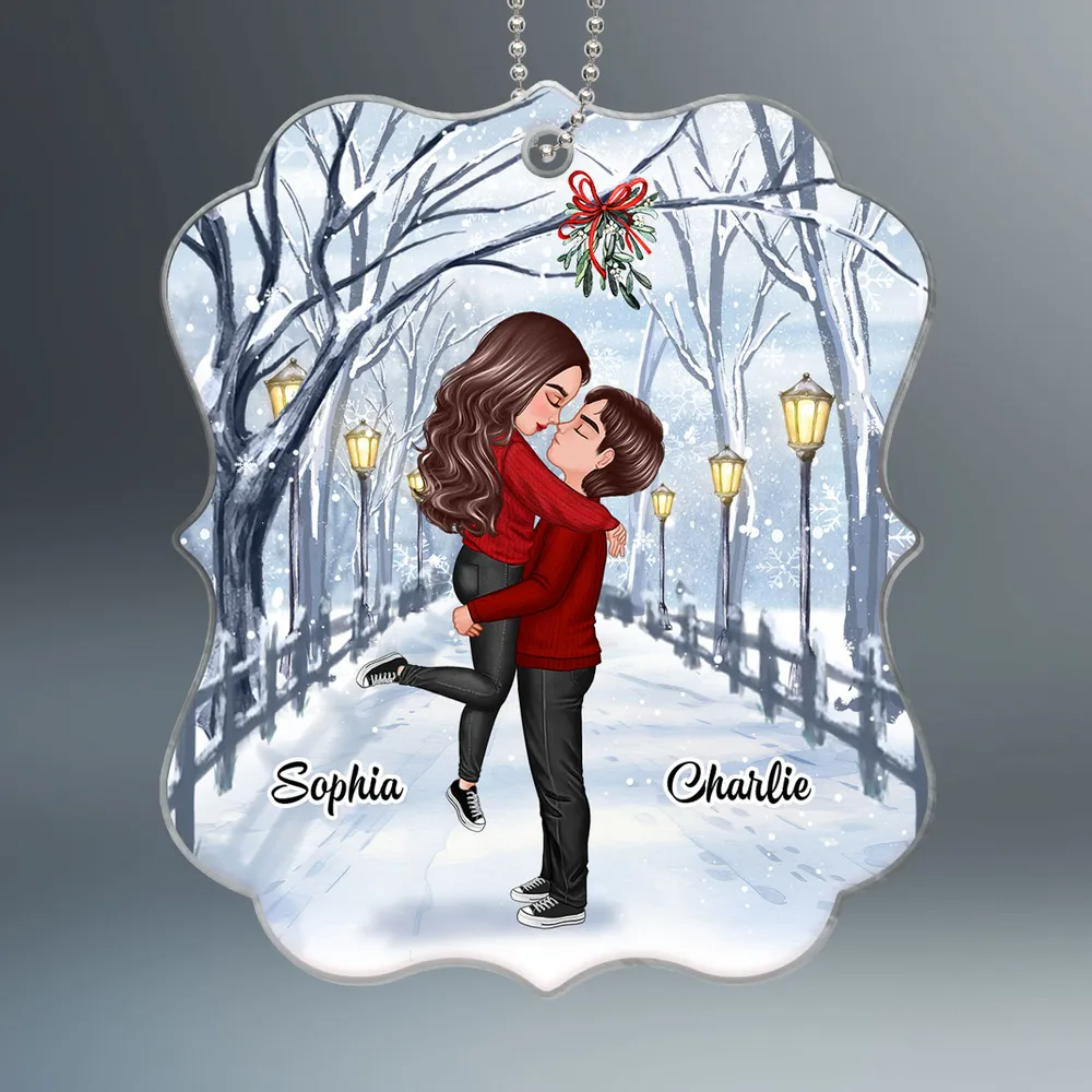 Doll Couple Hugging Kissing Under Mistletoe Personalized Acrylic Ornament