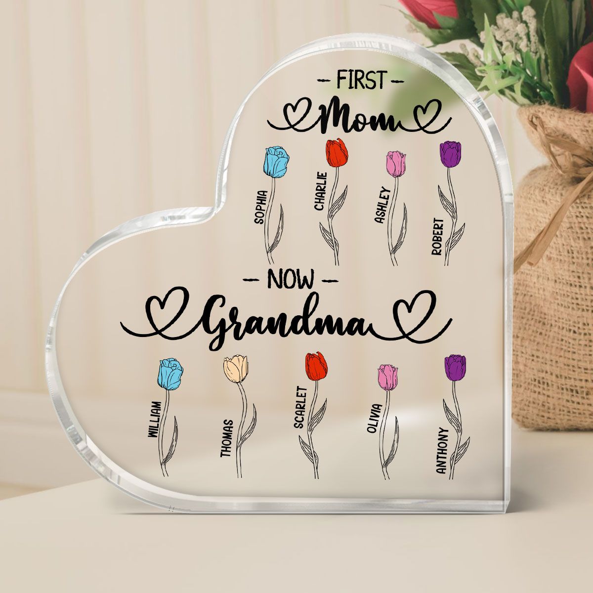 First Mom Now Grandma Tulip Flowers Personalized Heart Acrylic Block Plaque