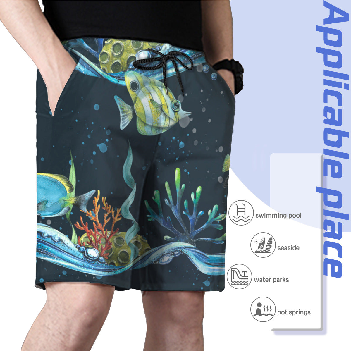 Material: 100% polyester, wearing comfortable and casual. Mesh lining featured. Relaxed-fit, suitable for daily wear or swimming.