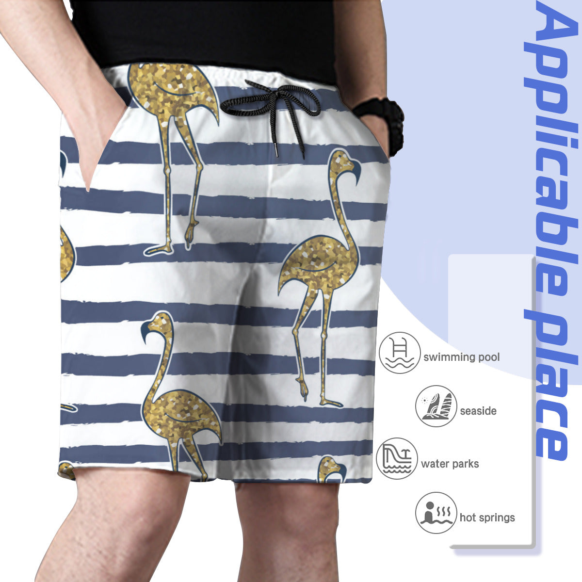 Material: 100% polyester, wearing comfortable and casual. Mesh lining featured. Relaxed-fit, suitable for daily wear or swimming.