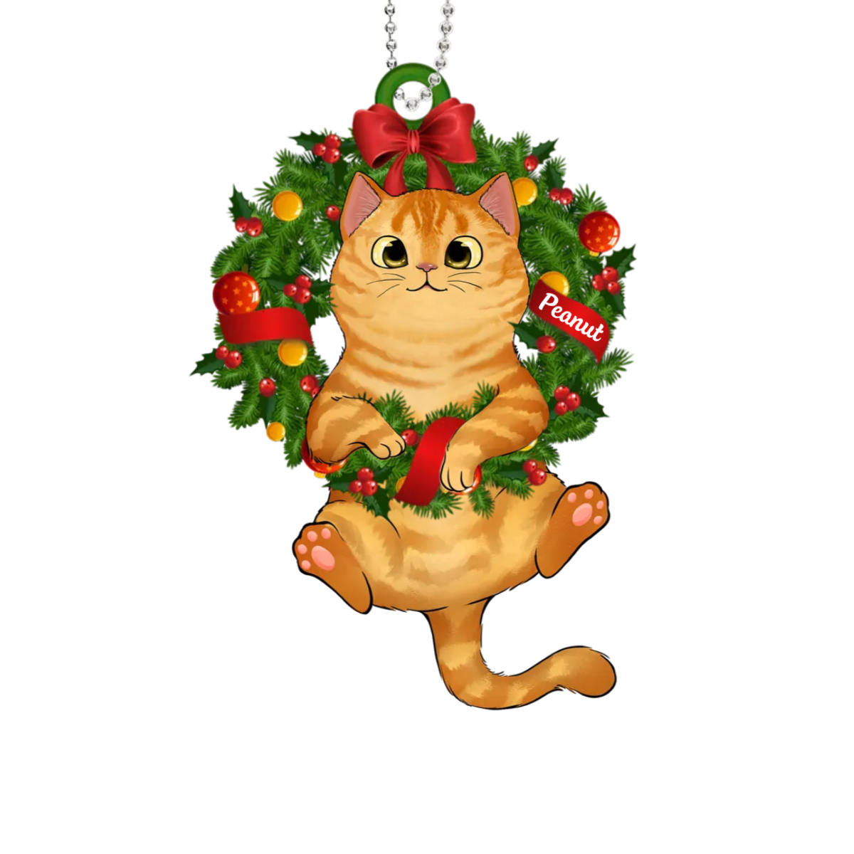 Fluffy Cat On Christmas Wreath Personalized Metal Ornament