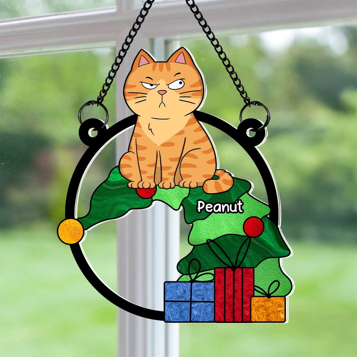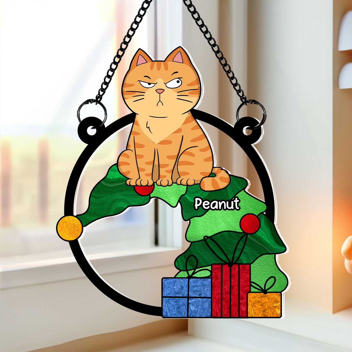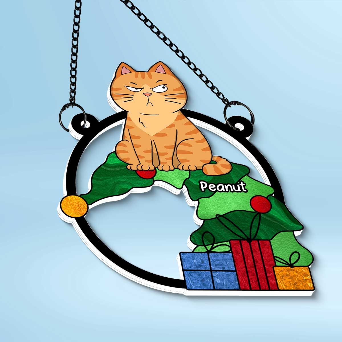 Funny Naughty Cat On Falling Christmas Tree Personalized Suncatcher, Christmas Decoration