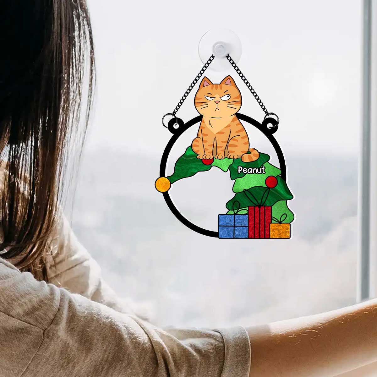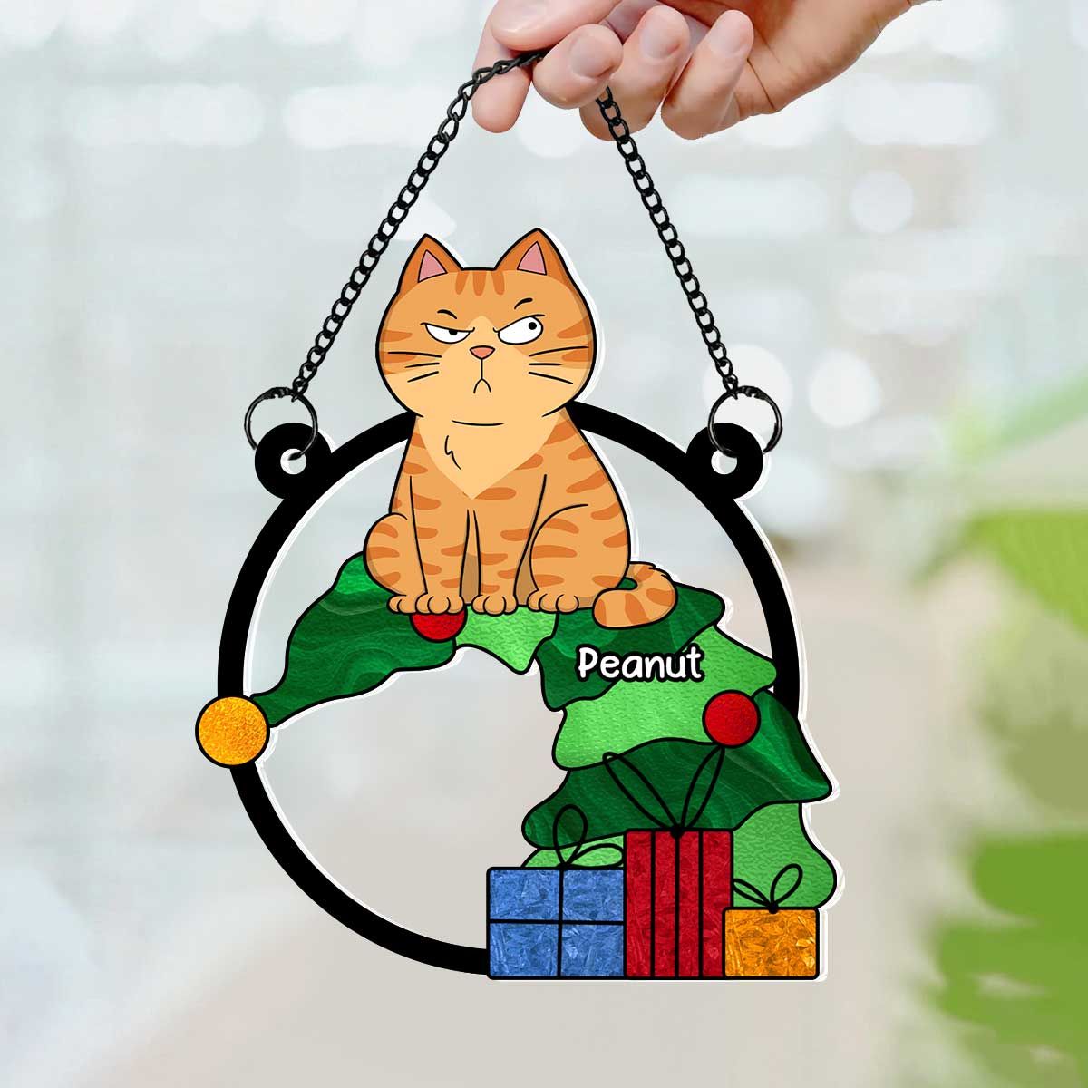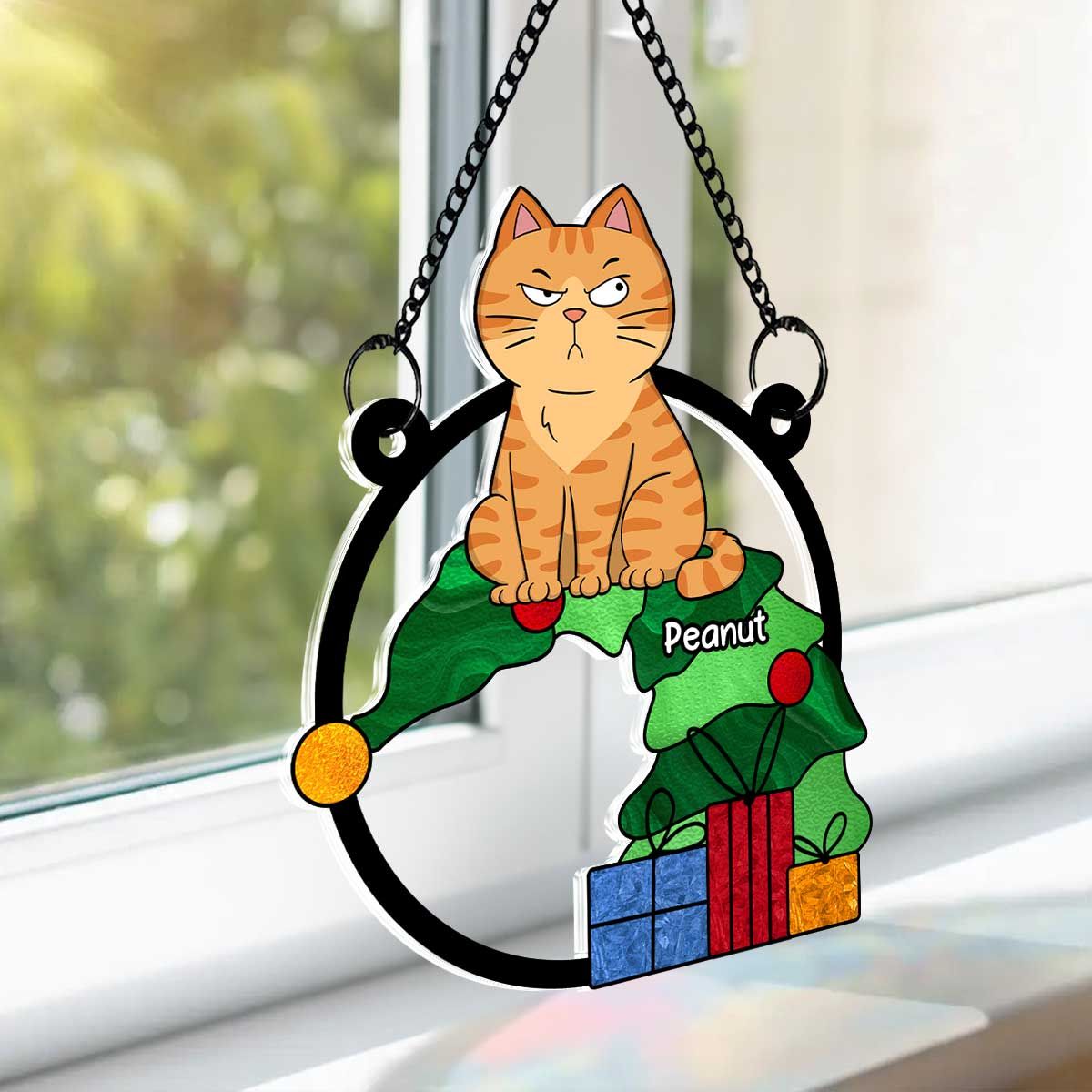 Funny Naughty Cat On Falling Christmas Tree Personalized Suncatcher, Christmas Decoration