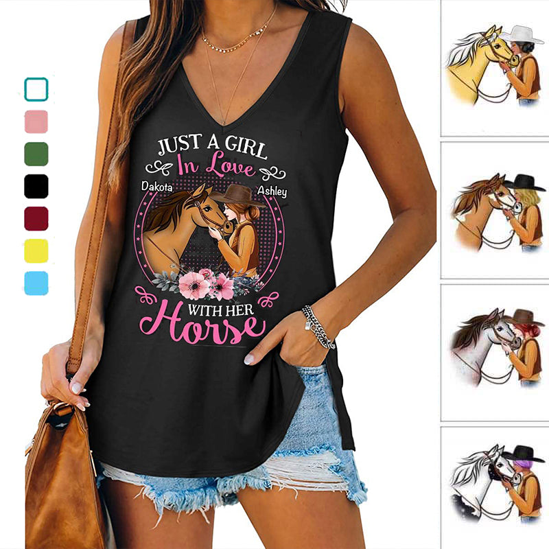Girl In Love With Her Horse Floral Personalized Women Tank Top V Neck Casual Flowy Sleeveless