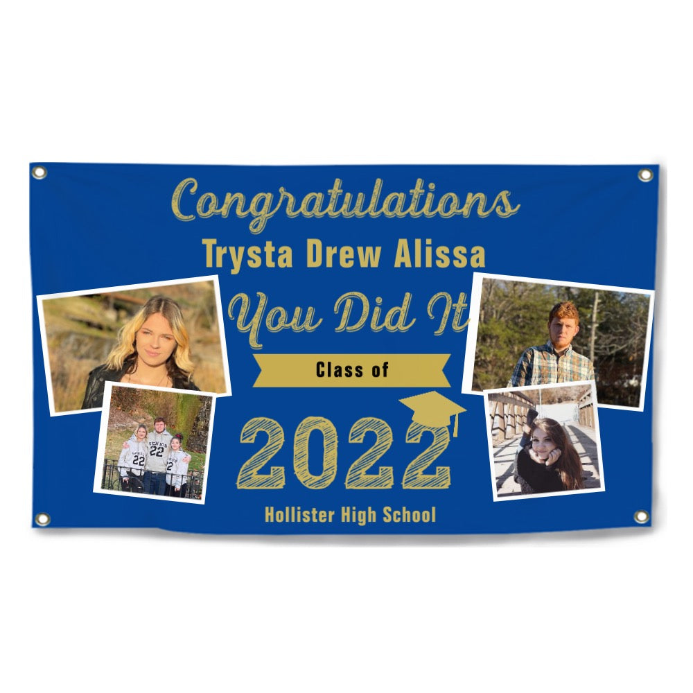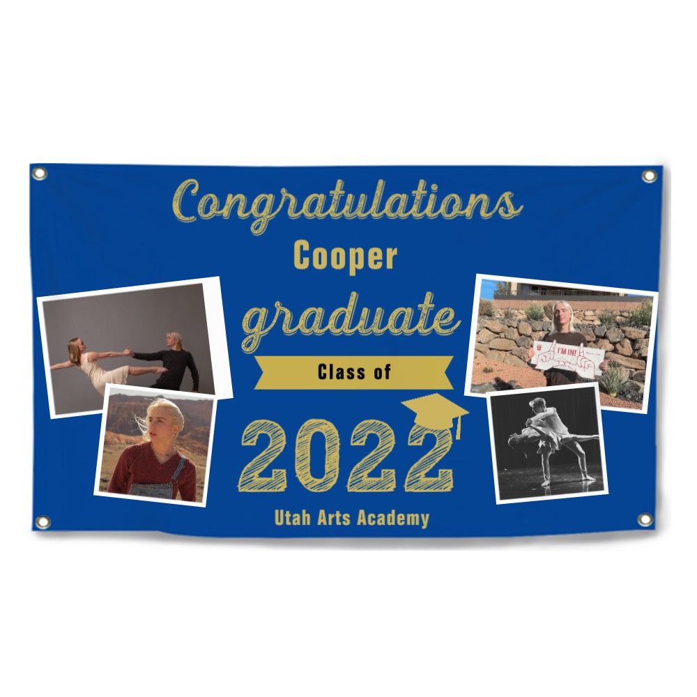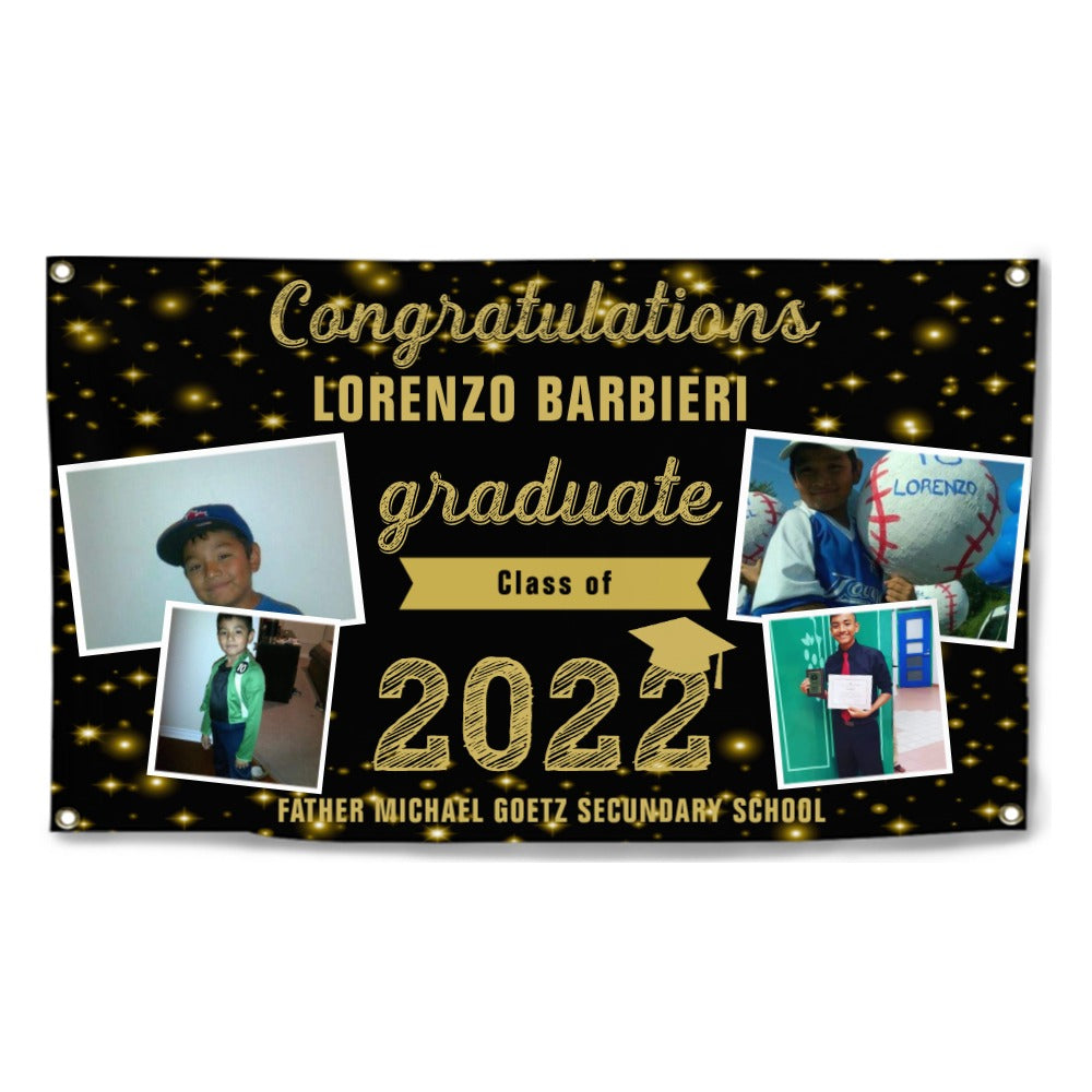 2023 Gold Sketch 4 Photo Collage Graduation Party Banner. Personalized With Name/Photo & 15 Backgrounds