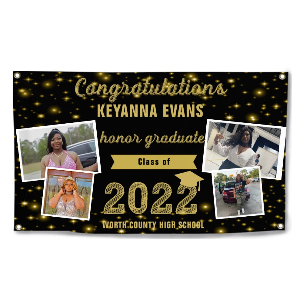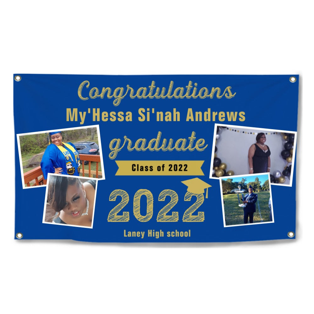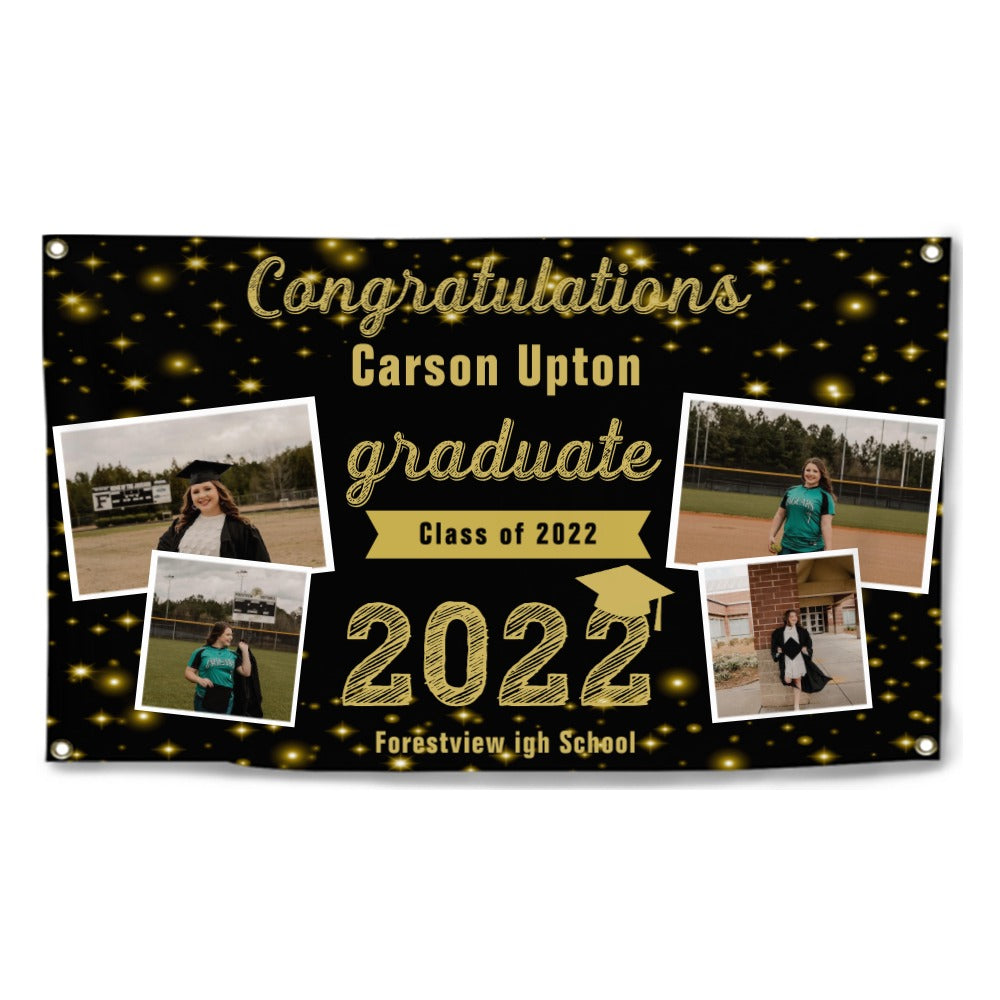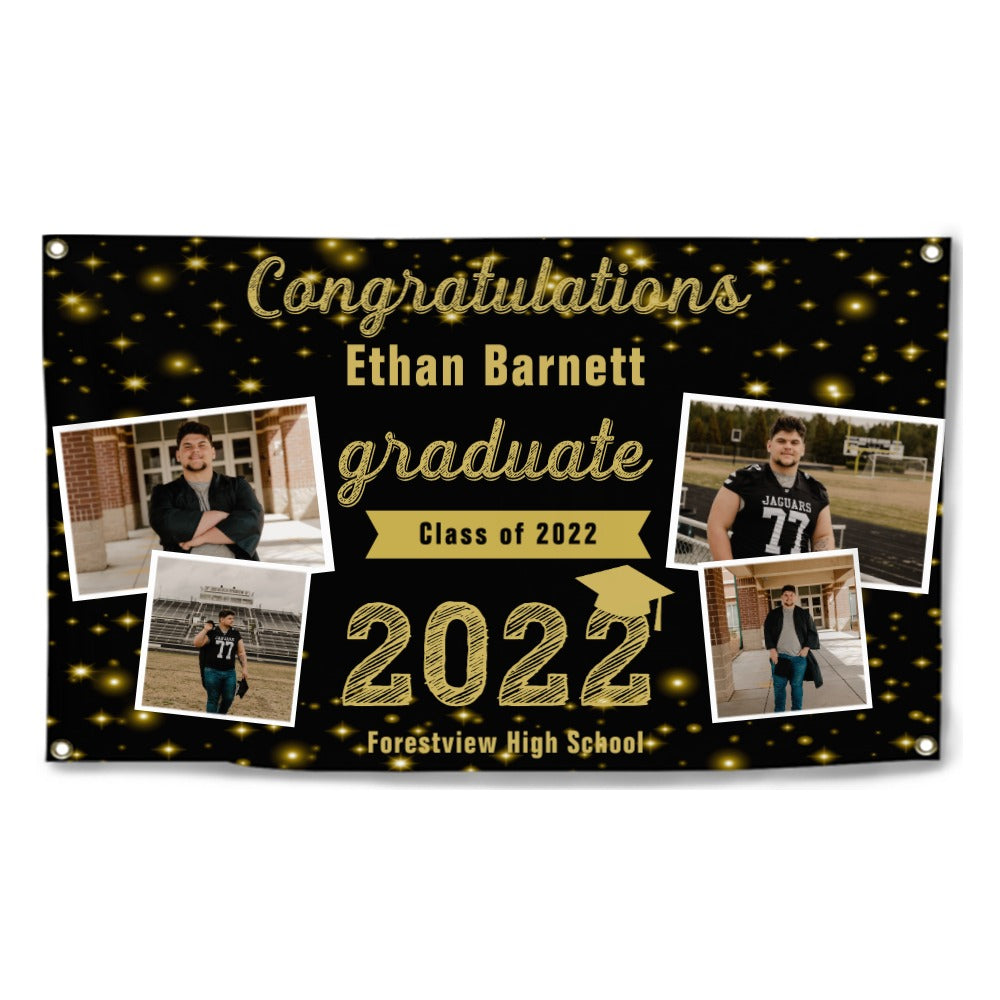 2023 Gold Sketch 4 Photo Collage Graduation Party Banner. Personalized With Name/Photo & 15 Backgrounds