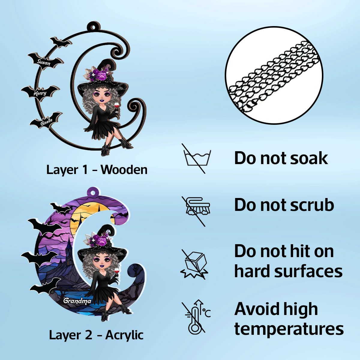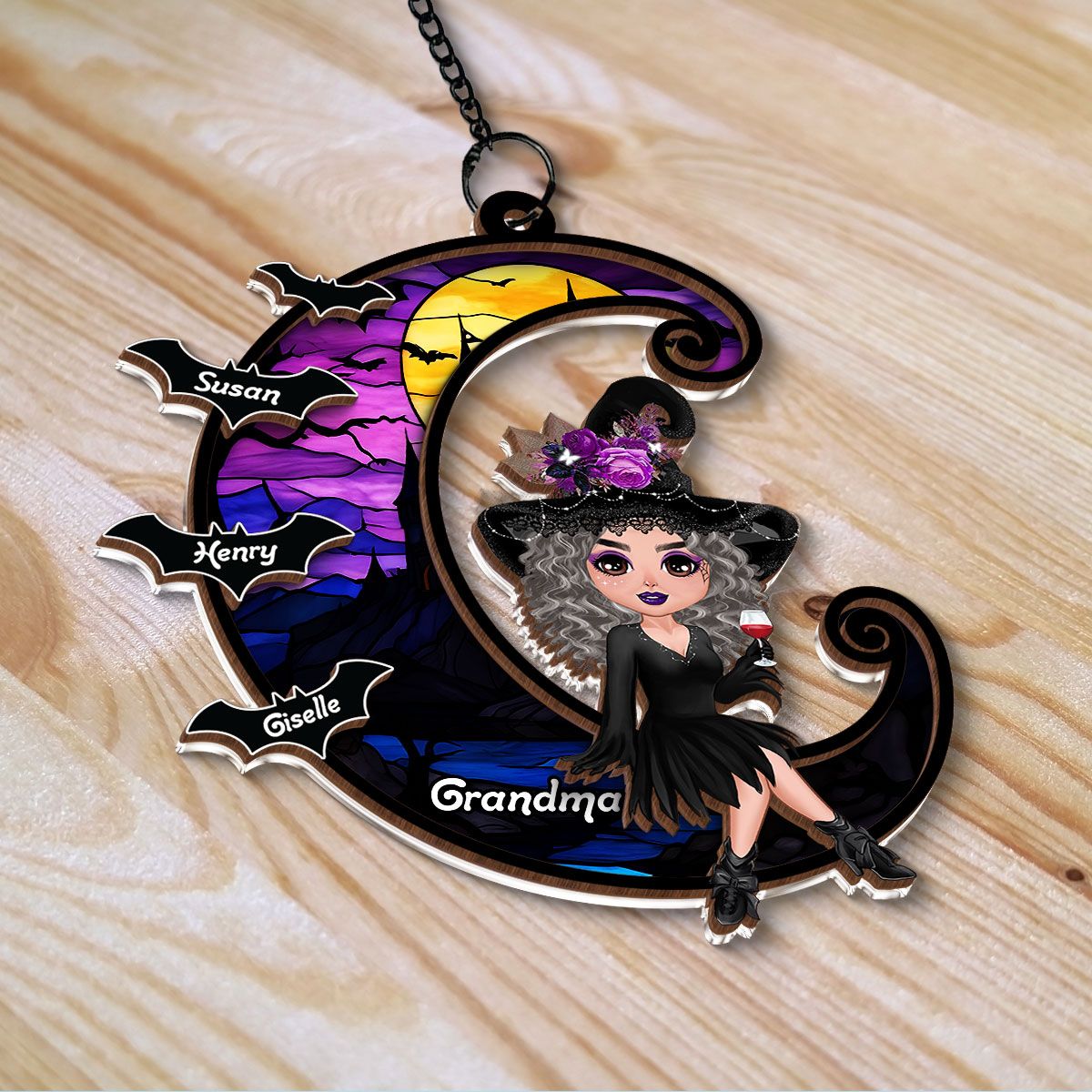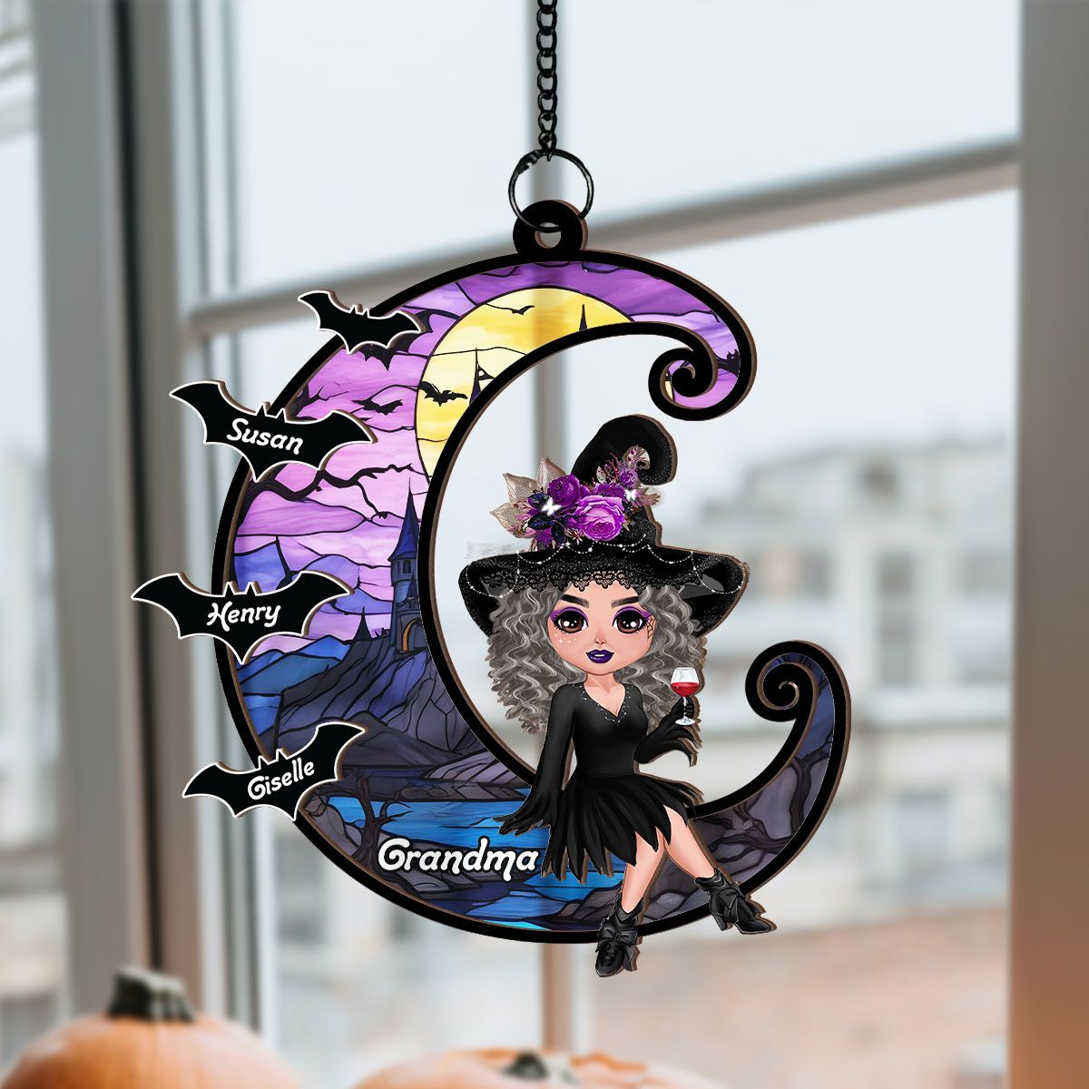 Grandma Mom Witch On Moon Personalized Suncatcher, Halloween Decor