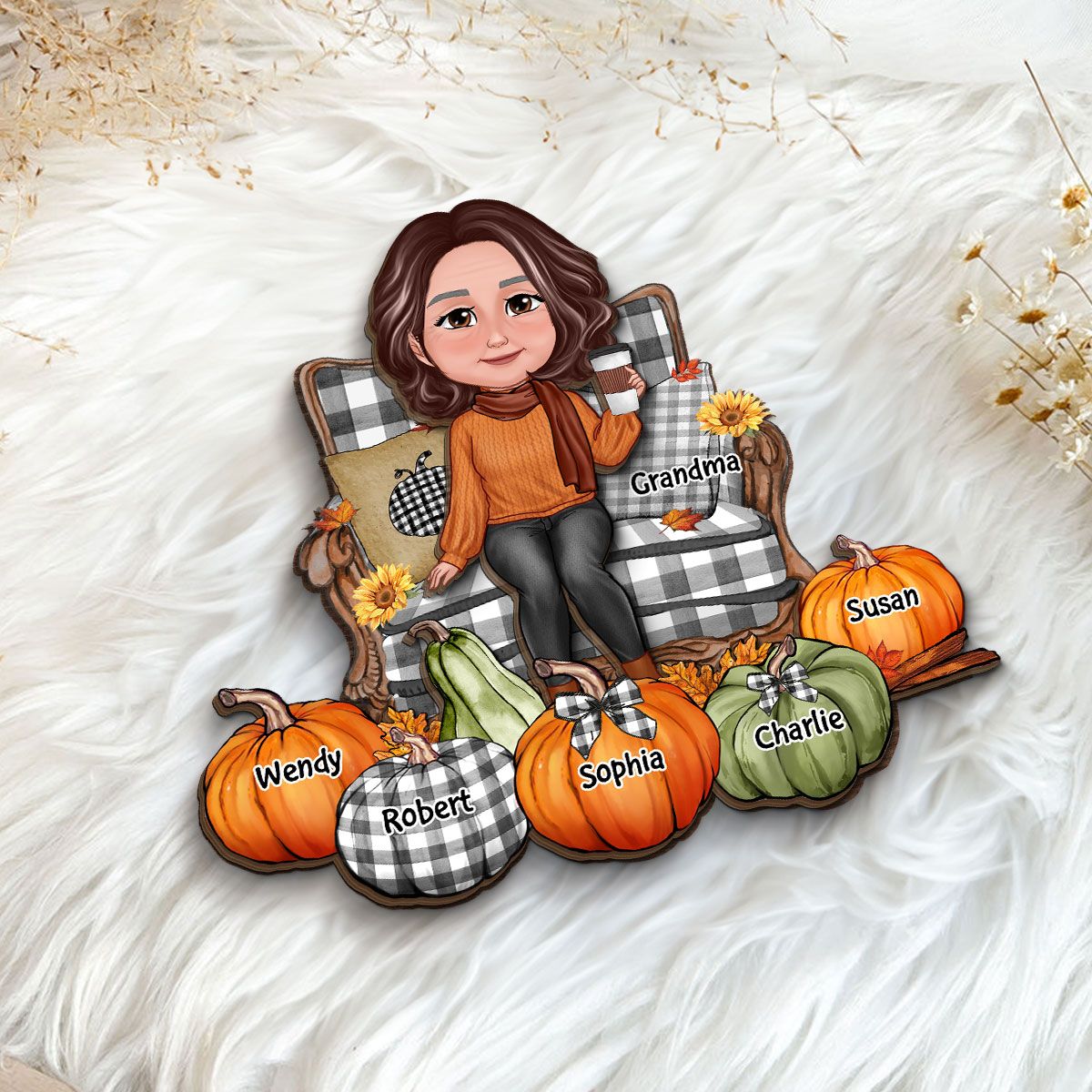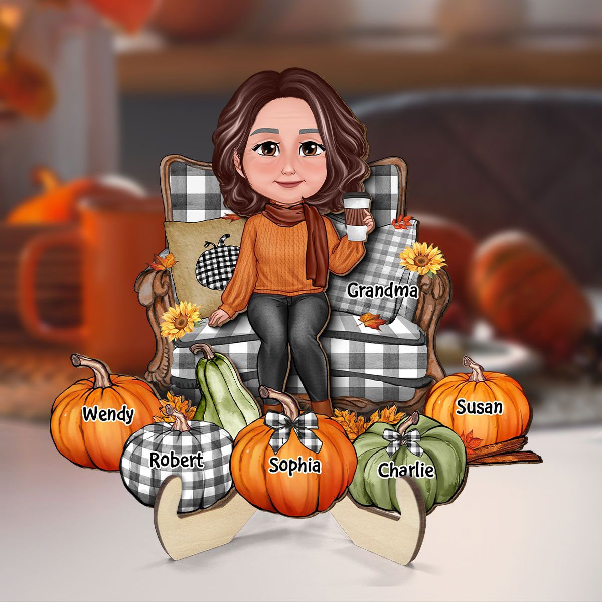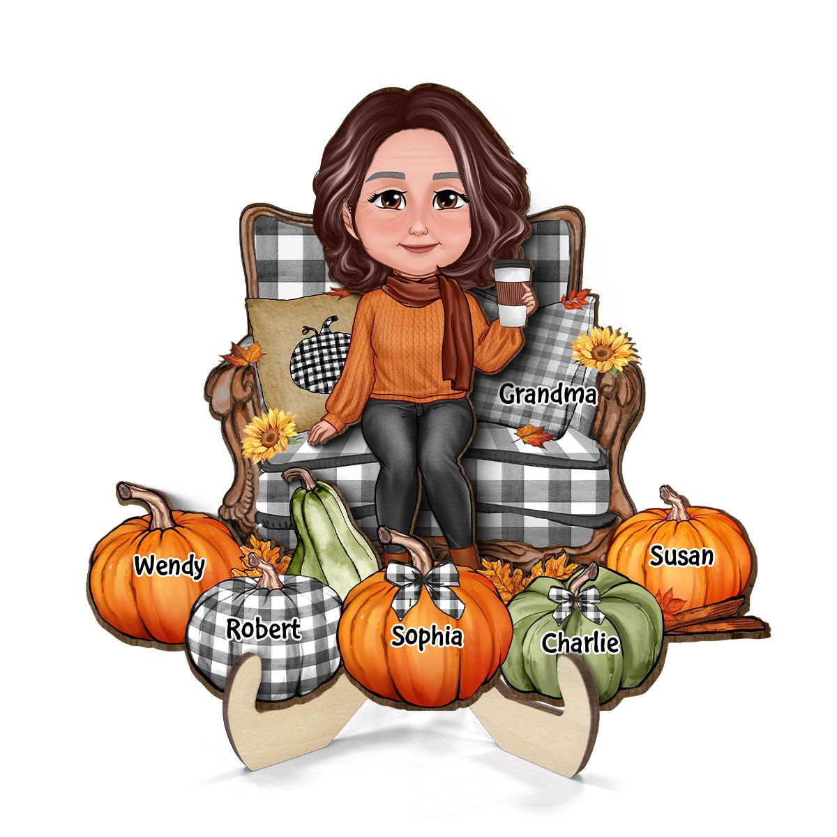 Grandma Sitting On Chair Pumpkins Personalized 2-Layer Wooden Plaque