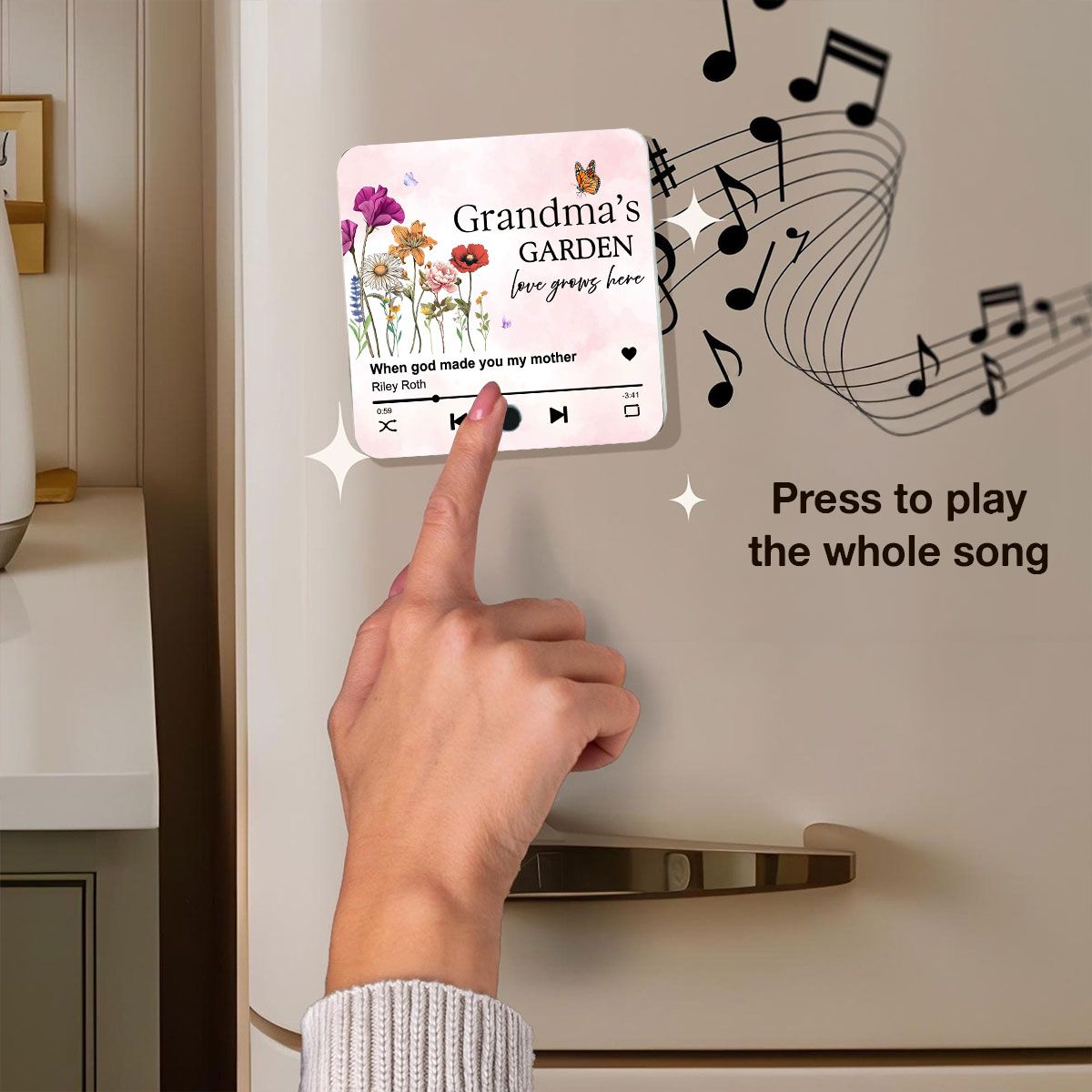 Press the button, and your custom tune fills the air! Enjoy crystal-clear sound quality that turns every trip to the fridge into a joyful experience.