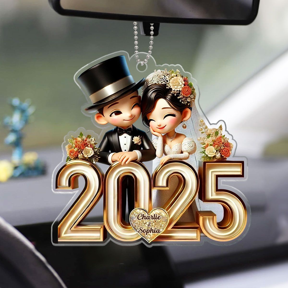 Happy Newlywed Cartoon Couple Personalized Car Hanger Ornament, Gift For Him, For Her, For Newlywed Couple