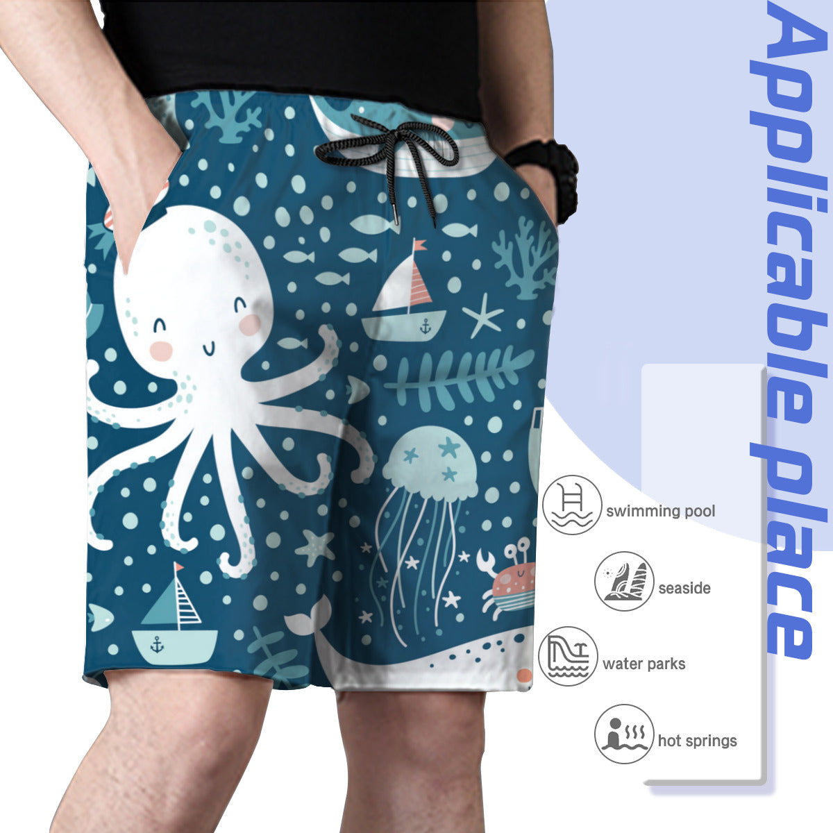 Material: 100% polyester, wearing comfortable and casual. Mesh lining featured. Relaxed-fit, suitable for daily wear or swimming.