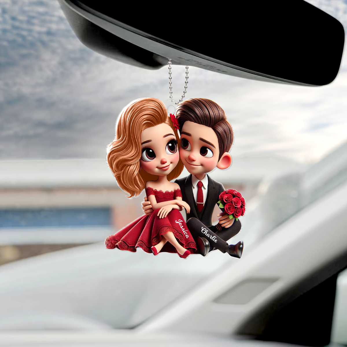 Romantic Valentine Couple Roses Personalized Acrylic Car Hanger, Anniversary Gift for him, Gift for her