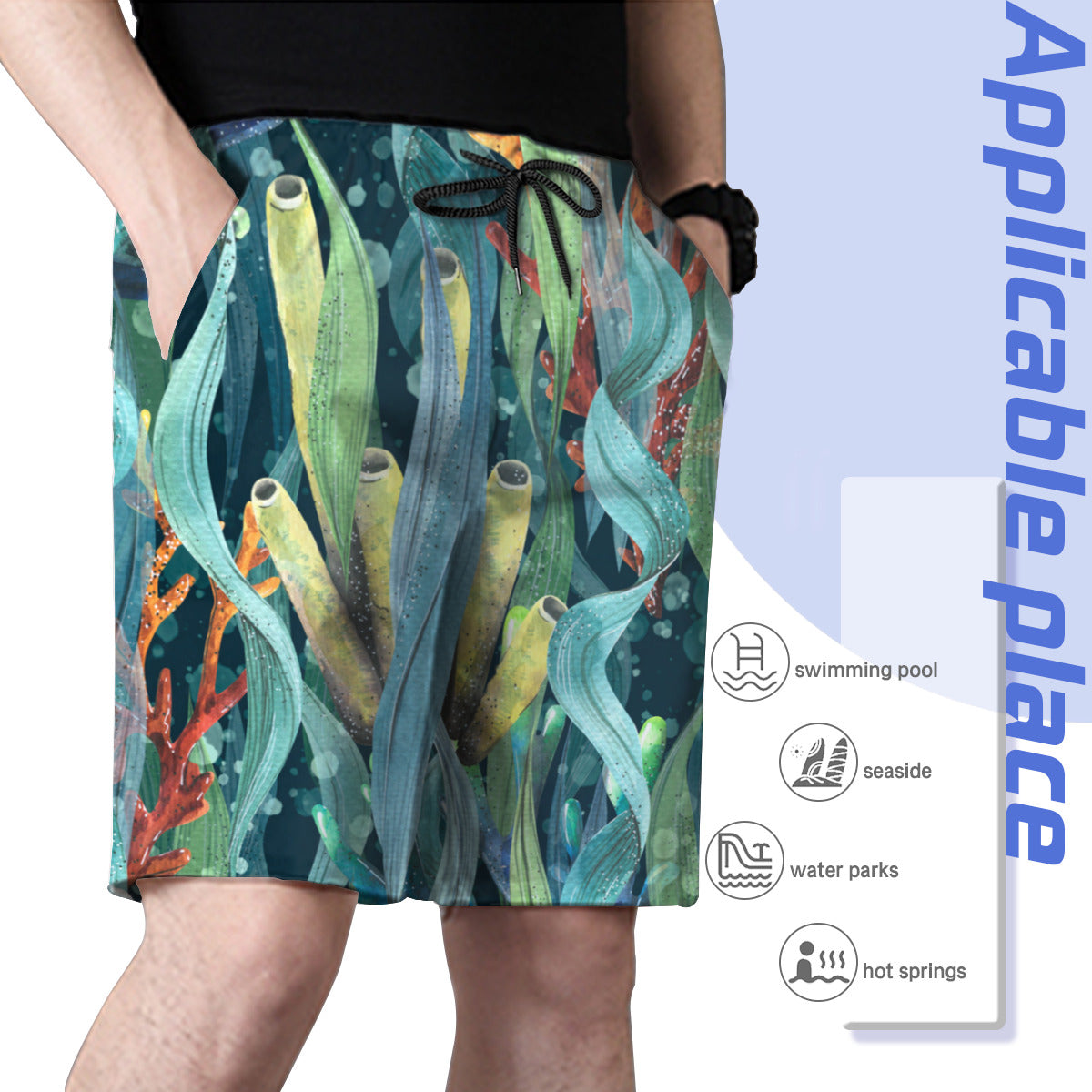 Material: 100% polyester, wearing comfortable and casual. Mesh lining featured. Relaxed-fit, suitable for daily wear or swimming.