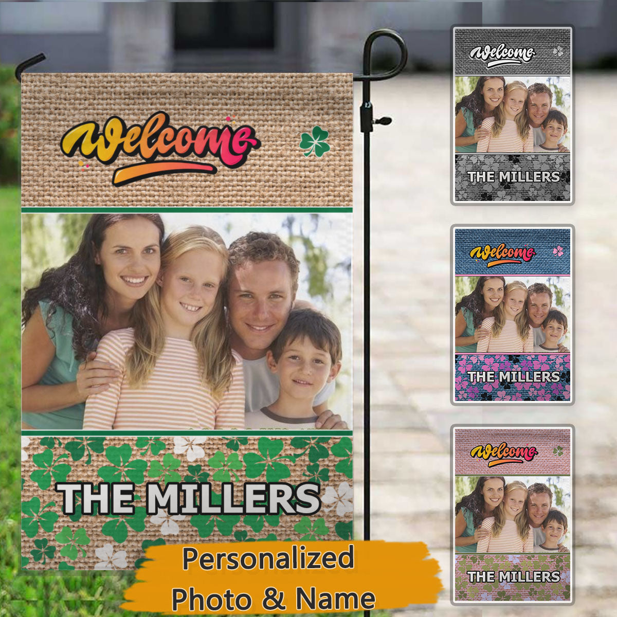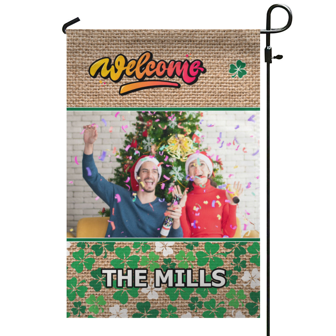 Shamrocks & Burlap Welcome – Personalized Photo & Family Name Garden & House Flag
