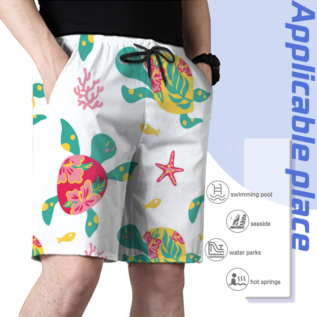 Material: 100% polyester, wearing comfortable and casual. Mesh lining featured. Relaxed-fit, suitable for daily wear or swimming.