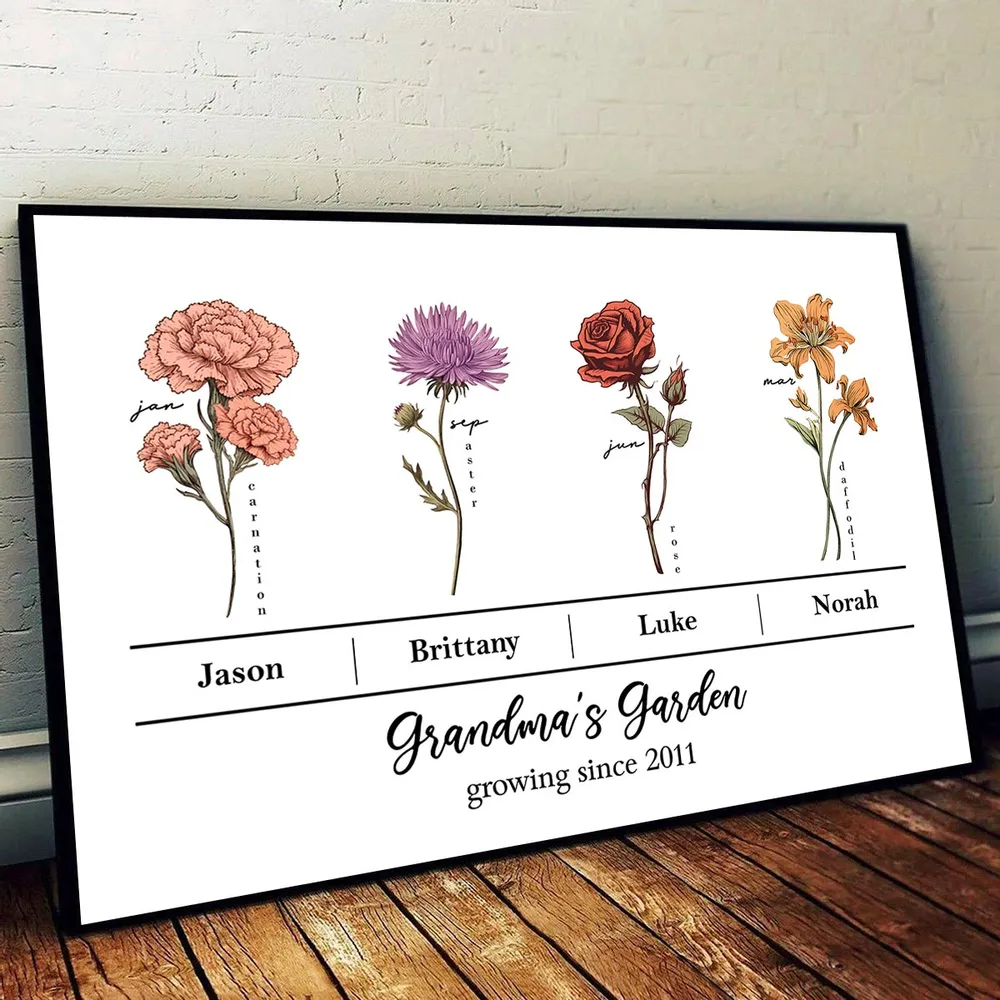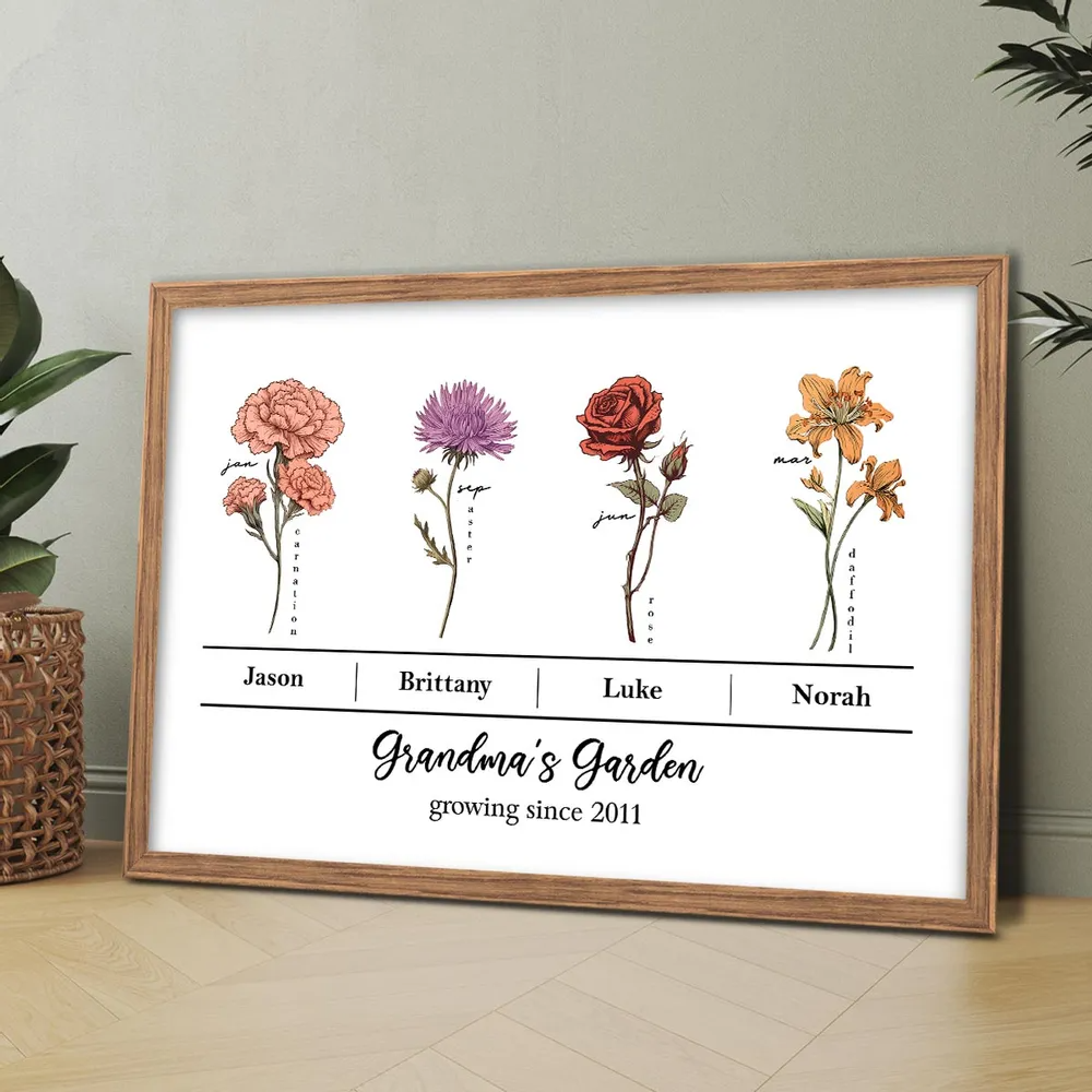 Vintage Birth Month Flowers Grandma‘s Garden With Kids Names Flowers Names Personalized Horizontal Poster
