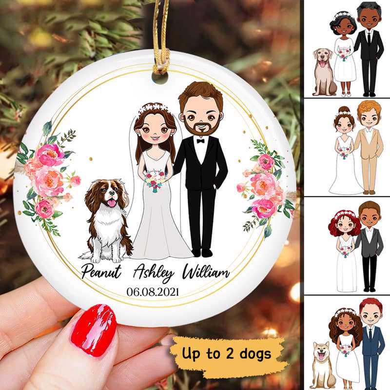 Wedding Couple Chibi With Dog Personalized Circle Ornament