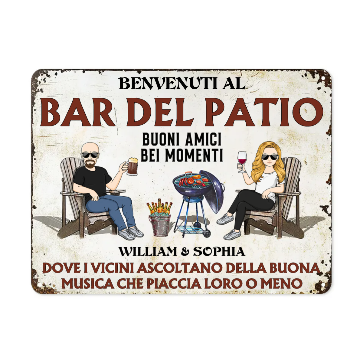 Benvenuti al bar del Patio - Segnaletica personalizzata in metallo - Coppia che ascolta buona musica