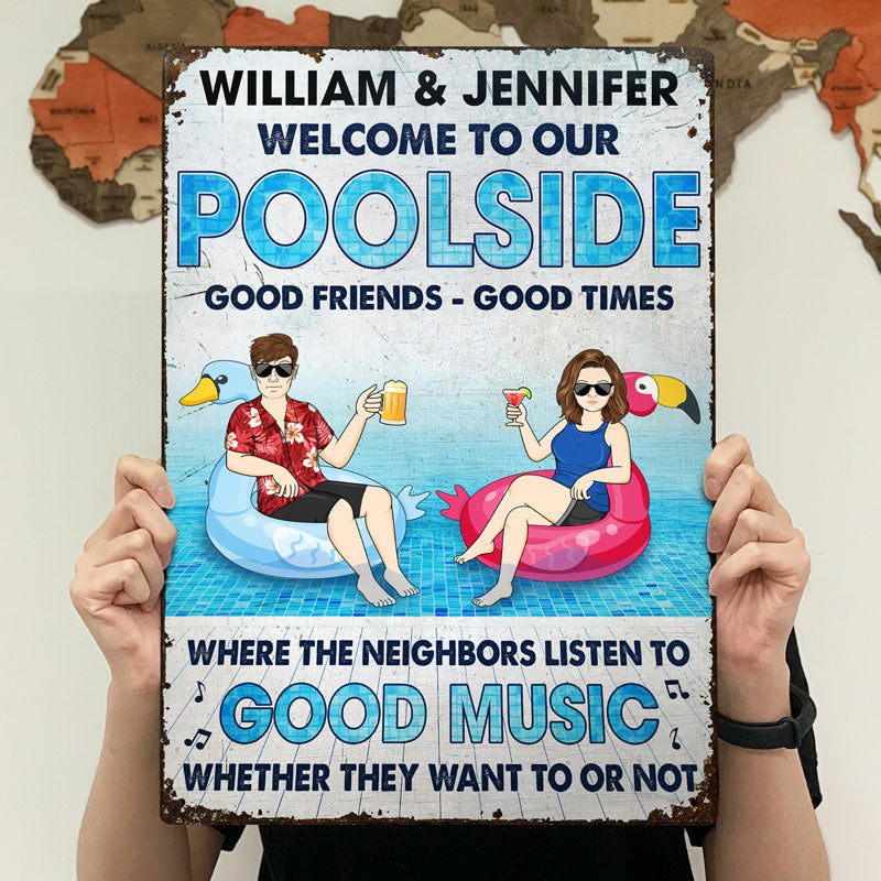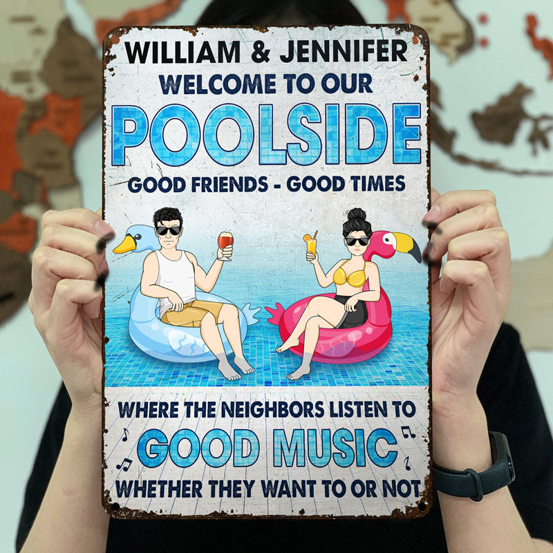 Couple Welcome Poolside Listen To Good Music Whether They Want To Or Not - Gift For Couple - Personalized Custom Classic Metal Signs