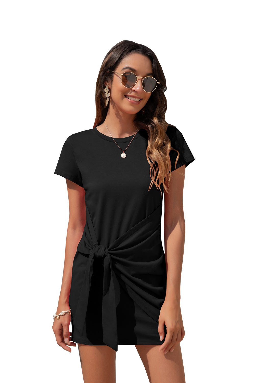- Unique Design: Casual solid color mini dress, Roll short sleeve with chic tie waist front is fanshionable and more elegant. Classic round neck, Slim fit, Unique wrap ruched front highlights the figure.